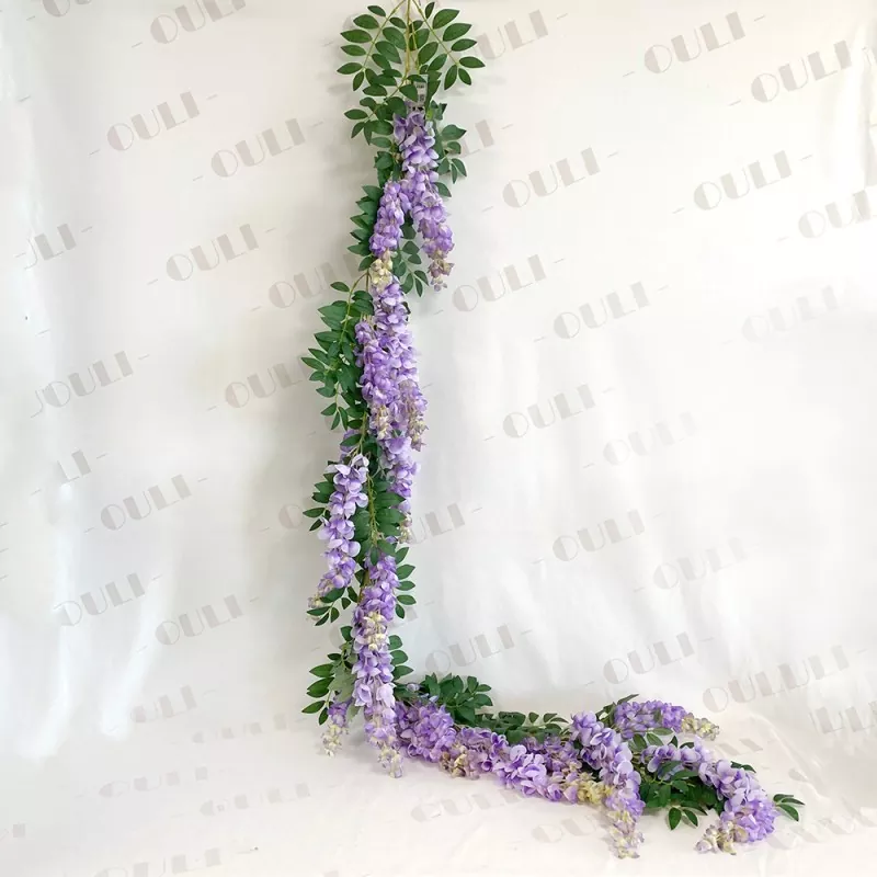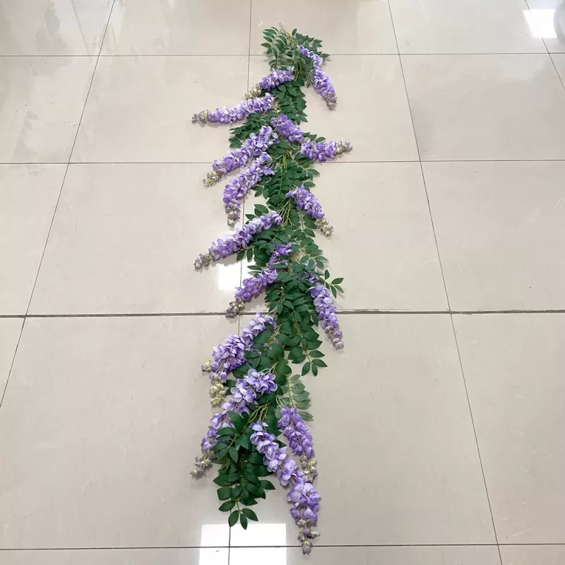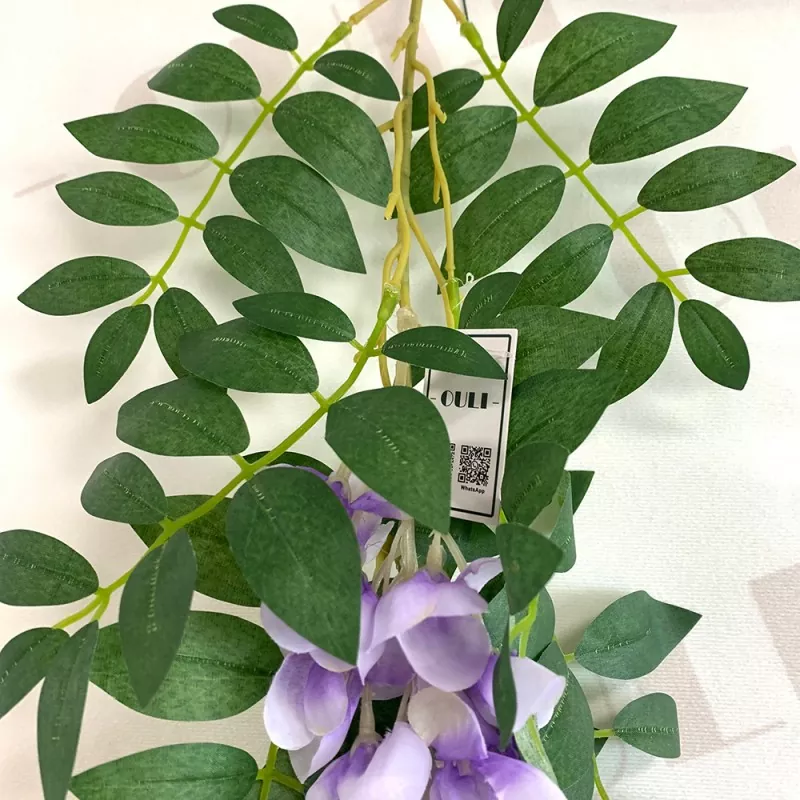 Эта фальшивая виноградная лоза длиной 2 метра изготовлена из высококачественной шелковой, пластиковой и железной проволоки. Каждая ветвь содержит 17 цветочных струн Witeria и 40-50 зеленых листьев. У этого есть естественная драпировка. Оба плотность цветов и листьев очень хороша. Он очень подходит для украшения свадебной арки, потолочного ландшафта, искусственной фона фона цветов или коммерческого космоса.