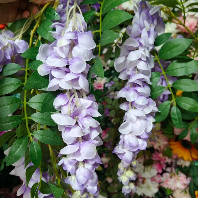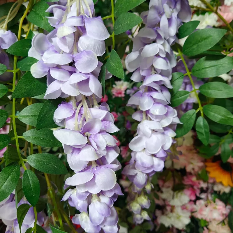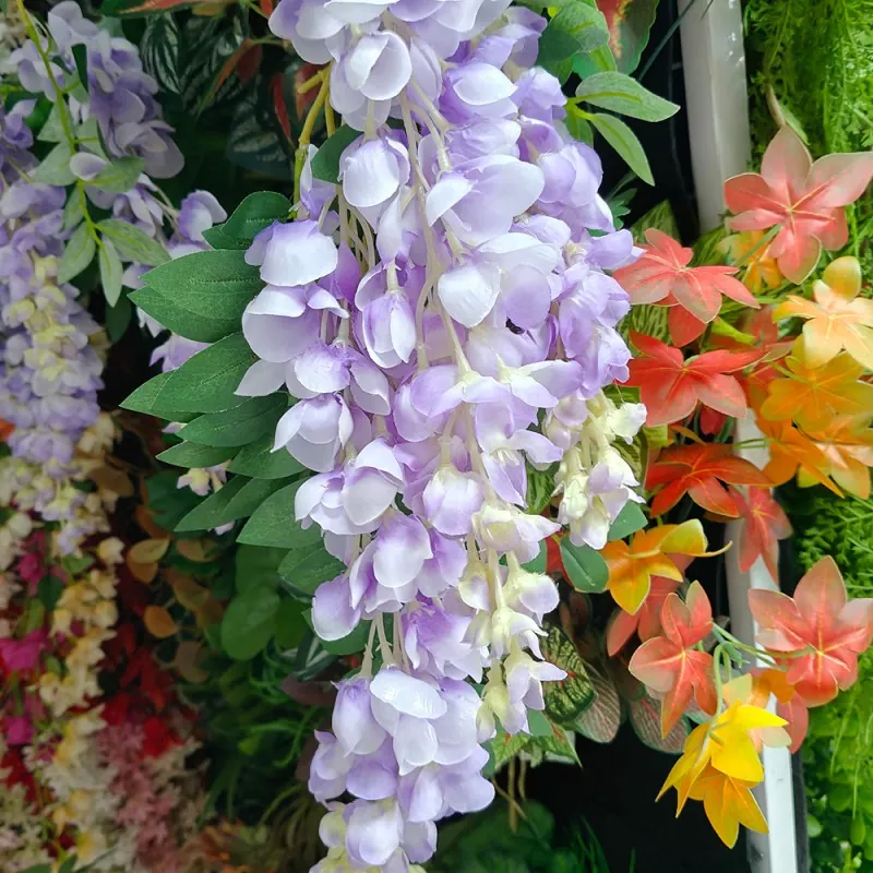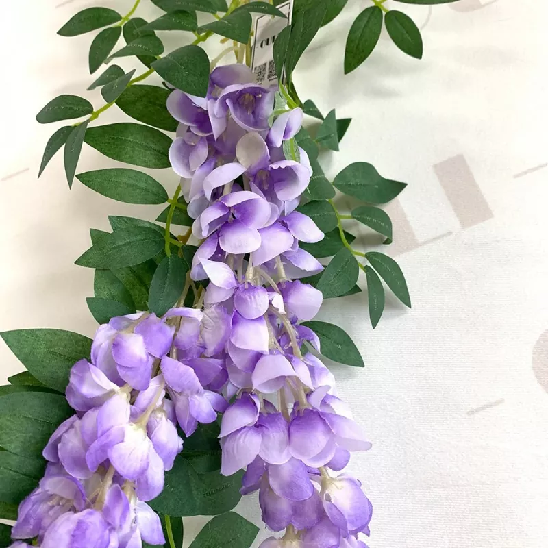Это искусственная стена глицинии. Каждая ветвь имеет длину около 200 см и имеет 17 цветочных струн глицинии и около 40-50 листьев.