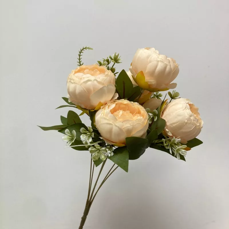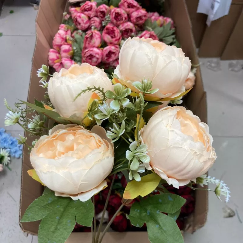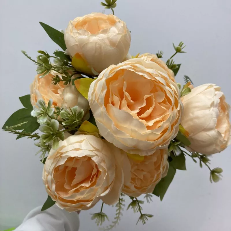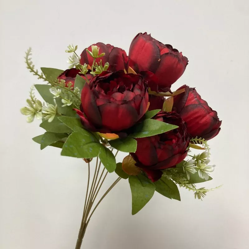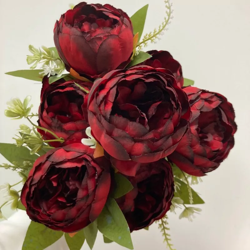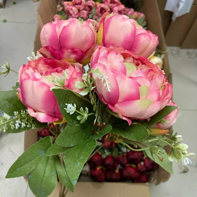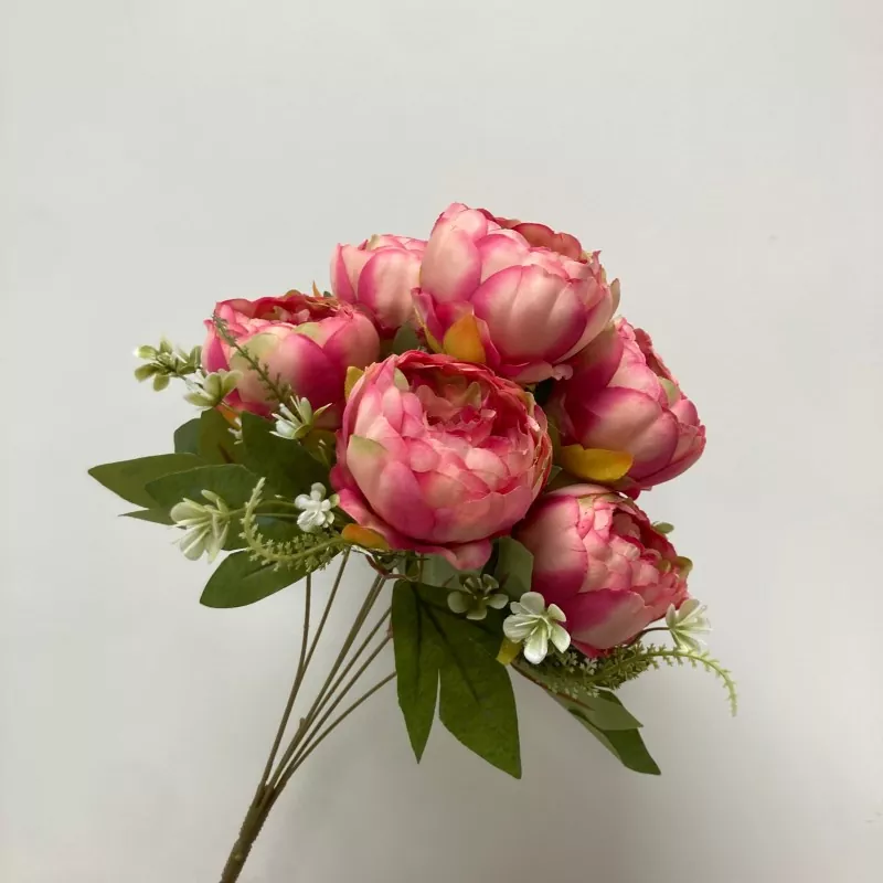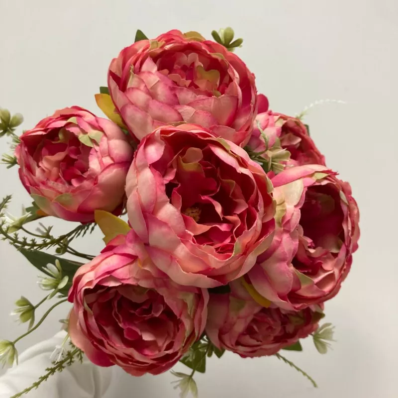 Каждый букет имеет высоту 45 см и содержит семь шелка искусственных цветочных головок пиона, каждый диаметр 10 см, украшенные зелеными листьями и другими мелкими цветочными акцентами.